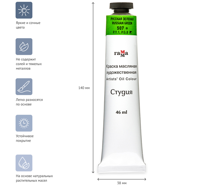 Масляные краски «Гамма» серии «Студия» изготавливаются из льняного масла, органических и неорганических пигментов. Кадмиево- кобальтовая группа заменена имитацией, что делает краски безопасными. Также в состав красок входит пчелиный воск, он придает краскам пастозную консистенцию и предотвращает от растрескивания после высыхания. Цветовой диапазон включает в себя как укрывистые краски, так и прозрачные. Масляные краски подходят для обучения и начинающих художников. Страна-производитель - РОССИЯ.