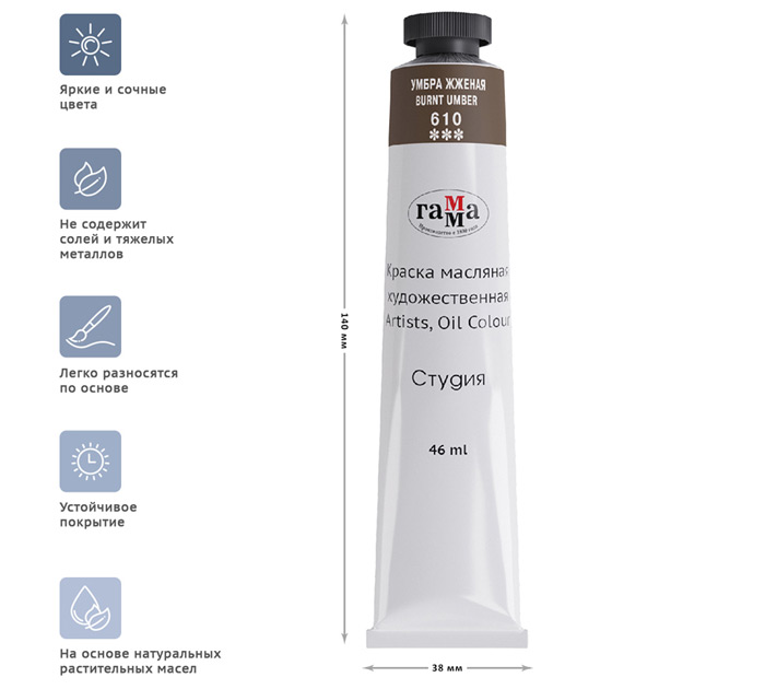 Масляные краски «Гамма» серии «Студия» изготавливаются из льняного масла, органических и неорганических пигментов. Кадмиево- кобальтовая группа заменена имитацией, что делает краски безопасными. Также в состав красок входит пчелиный воск, он придает краскам пастозную консистенцию и предотвращает от растрескивания после высыхания. Цветовой диапазон включает в себя как укрывистые краски, так и прозрачные. Масляные краски подходят для обучения и начинающих художников. Страна-производитель - РОССИЯ.