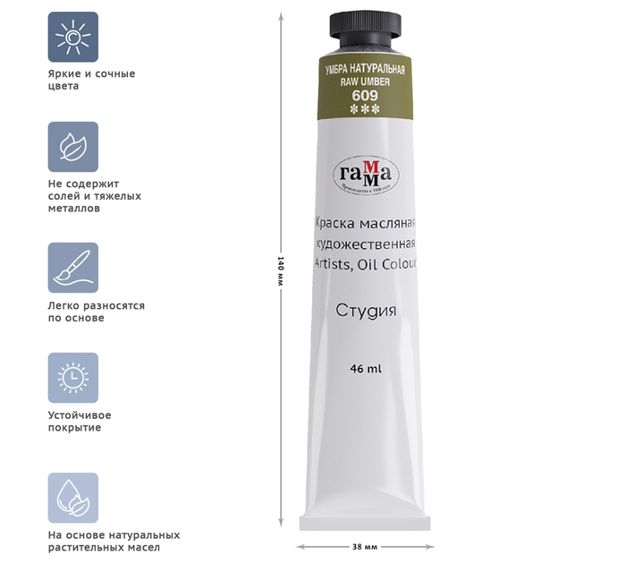 Масляные краски «Гамма» серии «Студия» изготавливаются из льняного масла, органических и неорганических пигментов. Кадмиево- кобальтовая группа заменена имитацией, что делает краски безопасными. Также в состав красок входит пчелиный воск, он придает краскам пастозную консистенцию и предотвращает от растрескивания после высыхания. Цветовой диапазон включает в себя как укрывистые краски, так и прозрачные. Масляные краски подходят для обучения и начинающих художников. Страна-производитель - РОССИЯ.