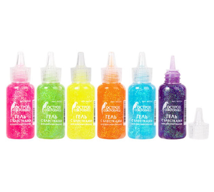 Гель с блёстками Остров сокровищ - это блестящие наборы для творчества и декорирования поделок из бумаги, картона, дерева, пластика и других материалов. Удобный наконечник с дозатором позволяет легко наносить гель на любую поверхность. В дисплее содержится 24 тубы геля с блёстками объёмом 20 мл, представлены в 6 различных неоновых цветах: голубой, фиолетовый, розовый, оранжевый, жёлтый, зелёный.Удобная упаковка позволяет легко работать с гель-клеем: просто открутите крышку, и нанесите гель-клей на изделие через тонкий наконечник. По окончании работы удалите лишний гель с наконечника и плотно закройте колпачок, чтобы предотвратить засыхание геля. После нанесения на поверхность гель высохнет в течение нескольких часов в зависимости от толщины нанесённого слоя, а на поделке останутся искрящиеся блёстки. Гель-клей не токсичен, легко смывается с рук и одежды тёплой водой с мылом.