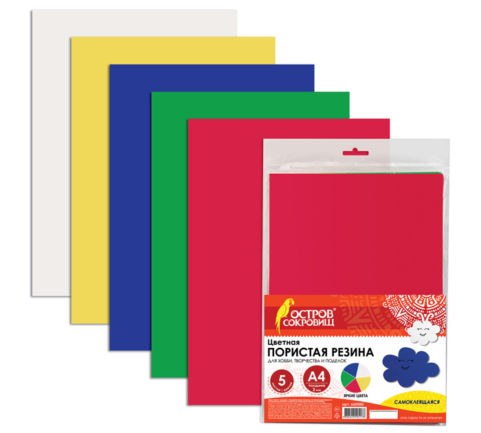 Цветная пористая резина (фоамиран) Остров сокровищ в листах предназначена для создания ярких творческих поделок дома, в школе или в детском саду. Используется для создания аппликаций. 5 ярких цветов на 5 самоклеящихся листах формата А4 позволят создать уникальную и эффектную поделку! Толщина каждого листа - 2 мм, размер листа - 29,7 х 21 см. Материал очень прост в использовании: легко режется и клеится, кроме того, его можно даже мыть! При нагревании материал легко принимает и держит любую заданную форму.