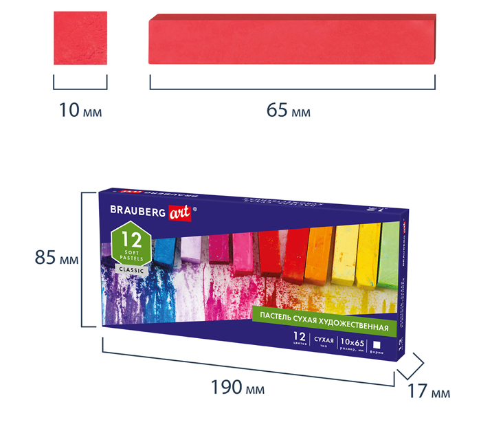 Сухая художественная пастель Brauberg Art «Classic» предназначена для графики и живописи. Она отличается насыщенностью цвета, мягким письмом и не крошится при использовании. Пастель подходит как для начинающих художников и любителей, так и профессионала. Легко ложится на различные фактуры цветной бумаги, бумагу для рисования, холст, картон, дерево, керамику. Также можно наносить на влажную поверхность или размывать водой для достижения акварельного эффекта. 12 цветов позволяют передать цветовую палитру. Высокое качество пигментов и связующего обеспечивает низкий расход материала, хорошую укрывистость и яркость цвета. Пастель имеет вид брусков с квадратным сечением. Не токсична и безопасна при использовании. При попадании на одежду или кожу рук легко смывается тёплой водой. Благодаря компактной упаковке удобно брать с собой.