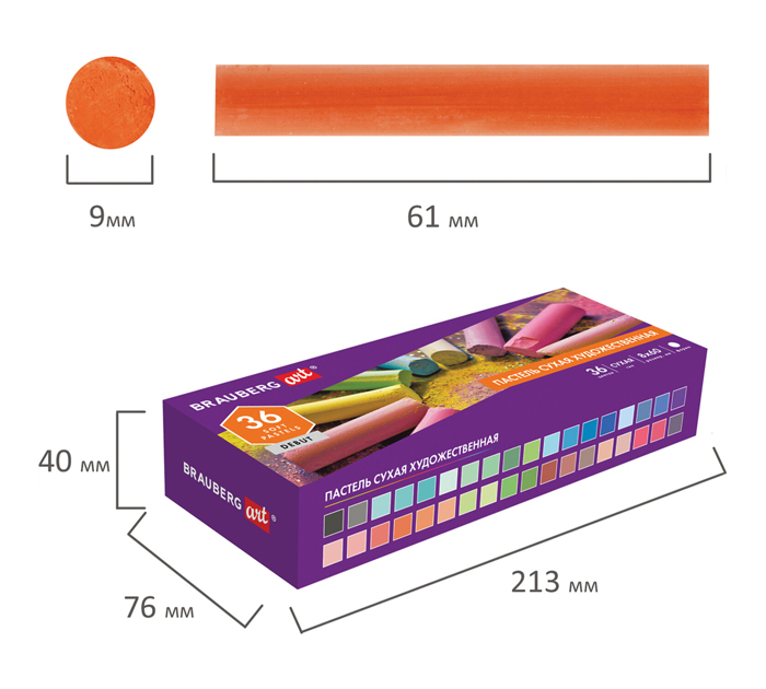 Сухая художественная пастель Brauberg Art «Debut» предназначена для графики и живописи. Прекрасно подойдет как для начинающих художников и любителей изобразительного искусства, так и профессионалов. Легко ложится на различные фактуры цветной бумаги, бумагу для рисования, холст, картон, дерево, керамику. Также можно наносить на влажную поверхность или размывать водой для достижения акварельного эффекта. 36 цветов позволяют полностью передать палитру цветов. Высокое качество пигментов и связующего обеспечивает низкий расход материала, хорошую укрывистость и яркость цвета. Пастель имеет вид брусков с круглым сечением, обёрнутых в бумажную обёртку. Она позволяет сохранять руки и одежду чистыми. Не токсична и безопасна при использовании. При попадании на одежду или кожу рук легко смывается тёплой водой. Благодаря компактной упаковке удобно брать с собой.