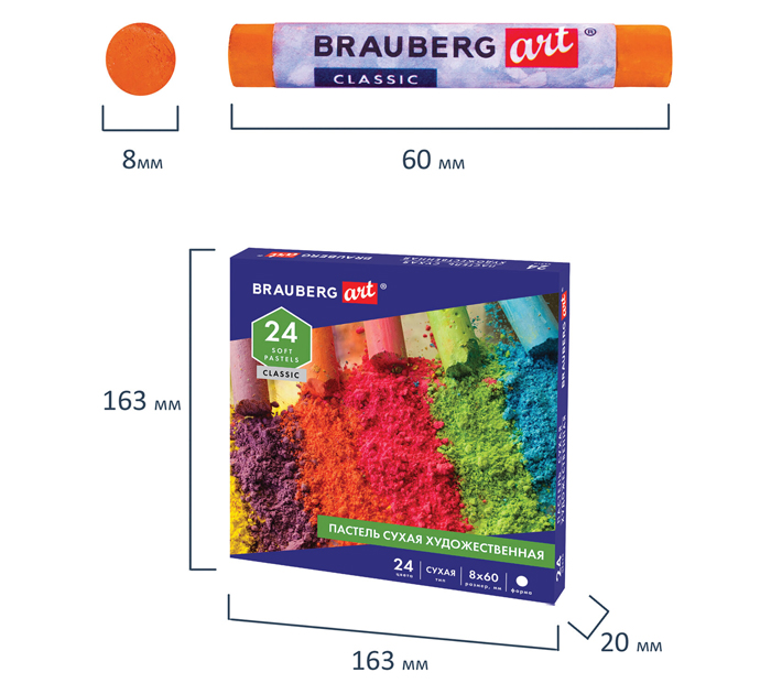 Сухая художественная пастель Brauberg Art «Classic» предназначена для графики и живописи. Она отличается насыщенностью цвета, мягким письмом и не крошится при использовании. Пастель подходит как для начинающих художников и любителей, так и профессионалов. Легко ложится на различные фактуры цветной бумаги, бумагу для рисования, холст, картон, дерево, керамику. Также можно наносить на влажную поверхность или размывать водой для достижения акварельного эффекта. 24 цвета позволяют полностью передать цветовую палитру. Высокое качество пигментов и связующего обеспечивает низкий расход материала, хорошую укрывистость и яркость цвета. Пастель имеет вид брусков с круглым сечением, обёрнутых в бумажную обёртку. Она позволяет сохранять руки и одежду чистыми. Не токсична и безопасна при использовании. При попадании на одежду или кожу рук легко смывается тёплой водой. Благодаря компактной упаковке удобно брать с собой. Художественная пастель пригодится как канцтовары школьникам, студентам, участникам мастер-классов, ученикам художественных школ, студий и училищ, живописных мастерских, так как у них представлена широкая гамма цветов. Отлично подойдёт для работы дома или пленэре.
