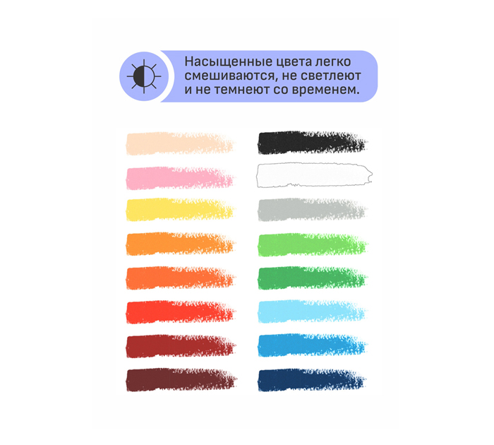 Масляная пастель «Студия» изготовлена на основе тонкотертых пигментов и минерального масла. Оставляет мягкий штрих, легко растушевывается. Яркие насыщенные цвета легко смешиваются, не светлеют и не темнеют со временем. Масляная пастель рисует на поверхностях разных фактур, не осыпается и не требует использования закрепителя краски. Толщина мелка 8,8 мм. Страна-производитель - КИТАЙ.