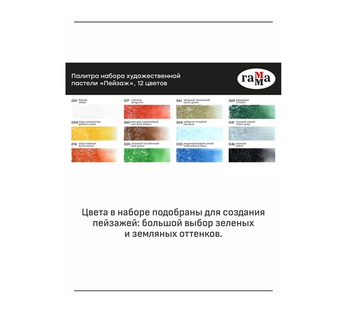Набор сухой художественной пастели средней мягкости. В наборе мелки квадратной формы в индивидуальной бумажной гильзе с указанием цвета. Пастель легко наносится, смешивается и растушевывается. Цвета в наборе подобраны для создания пейзажей: большой выбор зеленых и земляных оттенков.
