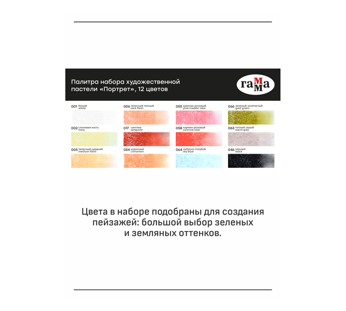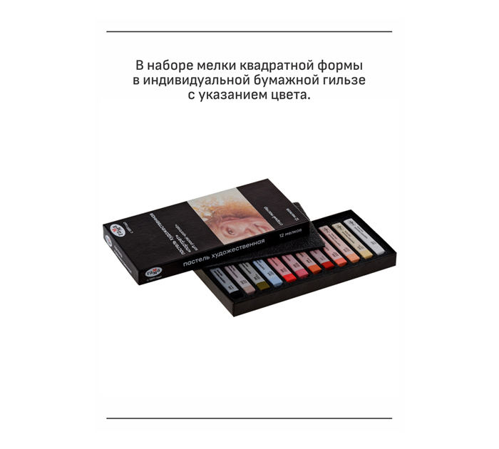 Набор сухой художественной пастели средней мягкости. В наборе мелки квадратной формы в индивидуальной бумажной гильзе с указанием цвета. Пастель легко наносится, смешивается и растушевывается. Цвета в наборе подобраны для рисования портретов: разнообразие телесных и красно-коричневых оттенков.