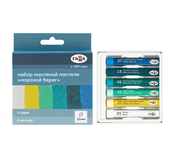 Масляная пастель ГАММА серии «Студия» изготовлена на основе тонкотертых пигментов и минерального масла. В наборе «Морской берег» тематическая палитра из 6 цветов пастели: кобальтовая синяя, зелёно-голубая, светлая бирюзовая, бирюзовая, цвет слоновой кости, белая. Мелки имеют увеличенный диаметр 10 мм, длина составляет 70 мм. Пастель круглой формы хорошо растушёвывается. У мелков мягкая податливая структура, они оставляют густой штрих, а слои легко накладываются друг на друга. Яркие насыщенные цвета легко смешиваются, не светлеют и не темнеют со временем. Масляная пастель рисует на поверхностях разных фактур, не осыпается и не требует использования закрепителя. Каждый мелок имеет индивидуальную бумажную обёртку с номером цвета и пигмента.Страна-производитель - КИТАЙ