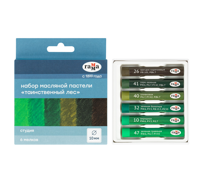 Масляная пастель ГАММА серии «Студия» изготовлена на основе тонкотертых пигментов и минерального масла. В наборе «Таинственный лес» тематическая палитра из 6 цветов пастели: ван-дик коричневый, серо-зелёная, оливковая, зелёная болотная, виридиан, зелёная травяная. Мелки имеют увеличенный диаметр 10 мм, длина составляет 70 мм. Пастель круглой формы хорошо растушёвывается. У мелков мягкая податливая структура, они оставляют густой штрих, а слои легко накладываются друг на друга. Яркие насыщенные цвета легко смешиваются, не светлеют и не темнеют со временем. Масляная пастель рисует на поверхностях разных фактур, не осыпается и не требует использования закрепителя. Каждый мелок имеет индивидуальную бумажную обёртку с номером цвета и пигмента.Страна-производитель - КИТАЙ
