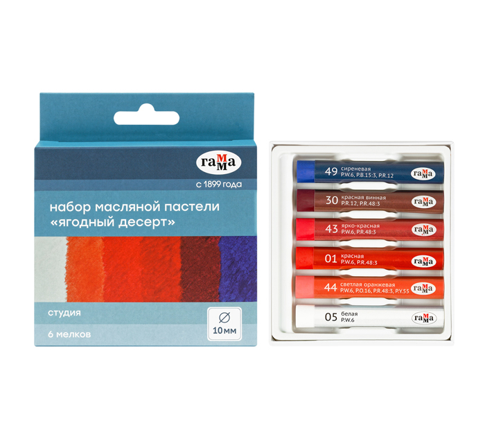 Масляная пастель ГАММА серии «Студия» изготовлена на основе тонкотертых пигментов и минерального масла. В наборе «Ягодный десерт» тематическая палитра из 6 цветов пастели: сиреневая, красная винная, ярко-красная, красная, светлая оранжевая, белая. Мелки имеют увеличенный диаметр 10 мм, длина составляет 70 мм. Пастель круглой формы хорошо растушёвывается. У мелков мягкая податливая структура, они оставляют густой штрих, а слои легко накладываются друг на друга. Яркие насыщенные цвета легко смешиваются, не светлеют и не темнеют со временем. Масляная пастель рисует на поверхностях разных фактур, не осыпается и не требует использования закрепителя. Каждый мелок имеет индивидуальную бумажную обёртку с номером цвета и пигмента.Страна-производитель - КИТАЙ