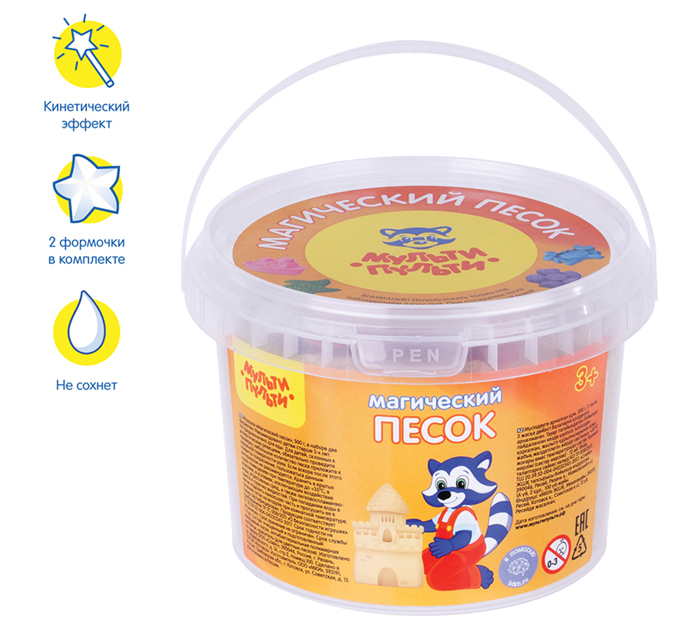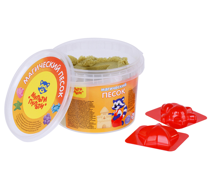 Песок для лепки «Мульти-Пульти» серия «Магический песок» весом 500 граммов в пластиковом ведре. В состав набора входят две формочки для лепки. Цвет – жёлтый. Магический песок обладает кинетическим эффектом и достаточно пластичен, не сохнет, хорошо держит форму и лепится с помощью формочек или просто руками. Подходит для детей старше трёх лет.