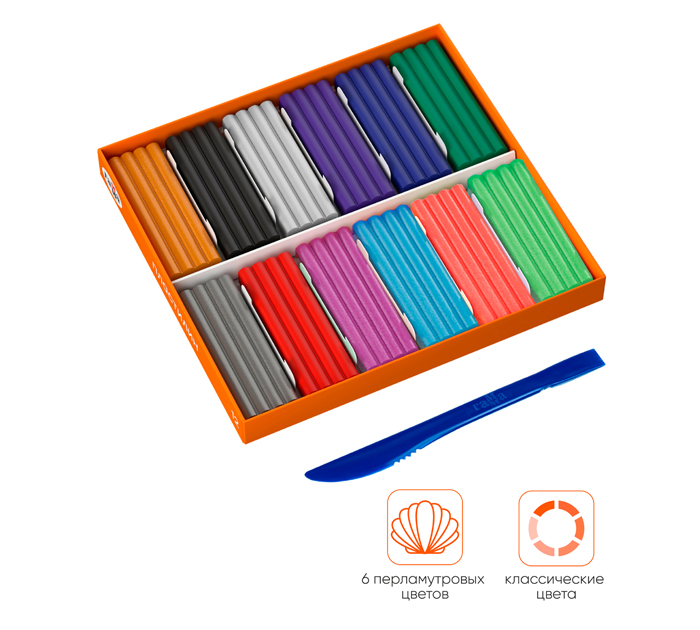 Уникальная серия пластилина «Оранжевое солнце» - это сочетание классических цветов и цветов с различными эффектами. В наборе 12 цветов: 6 классических и 6 цветов с эффектом перламутра. Уникальная цветовая палитра позволяет создавать эффектные поделки. У пластилина приятная текстура и высокая пластичность он хорошо держит форму и не крошится. Без выраженного химического запаха, не пачкает руки и рабочую поверхность. Пластиковый стек в комплекте.