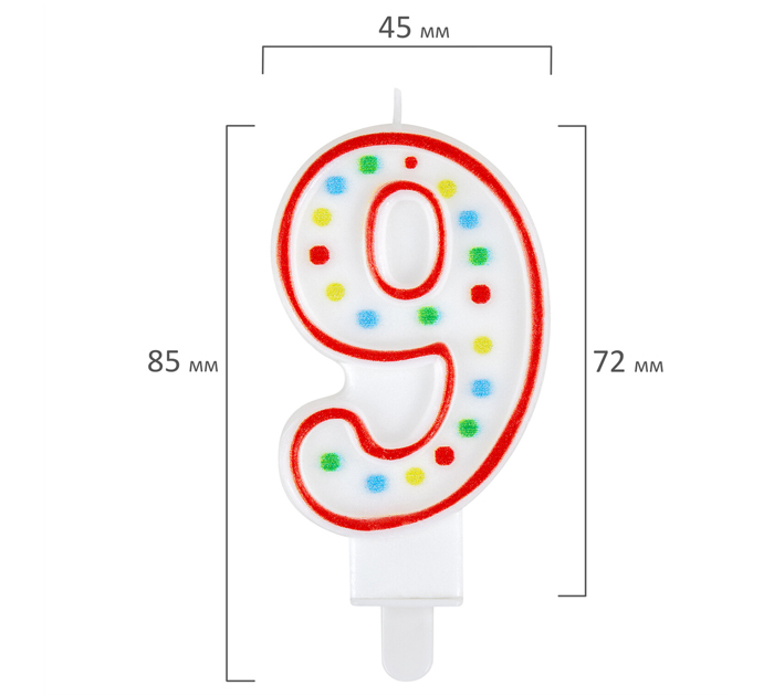 Свечи для торта являются неотъемлемым атрибутом праздника. Свеча-цифра для торта «9» ЗОЛОТАЯ СКАЗКА станет прекрасным украшением торта и других кондитерских изделий по случаю дня рождения, юбилея и любого другого торжества. Двусторонняя свеча с рисунком в виде конфетти представляет собой цифру «9». Свеча выполнена из парафина и укомплектована пластиковым держателем для удобства размещения цифры на торте или другом кондитерском изделии. Высота свечи вместе с держателем - 8,5 см, ширина - 4 см, толщина - 1,2 см.