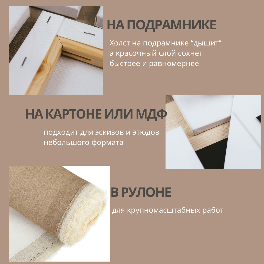 Самые распространенные хлопок и лен. Хлопковый холст доступен по цене и широко распространен, в то время как льняной холст считается более качественным, но и более дорогим.